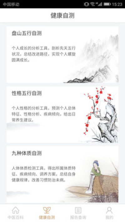 包括盘山五行测试、性格五行测试和九种体质测试,通过回答专项问题,得出自己所属类别,根据类别可以掌握个人身心规律,进行有效健康管理。