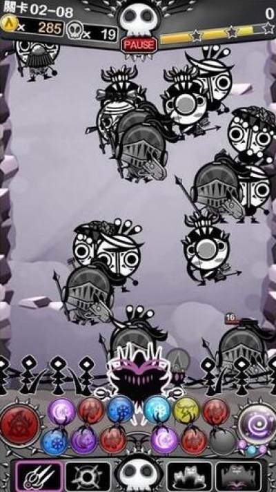 在游戏里当了这么久的拯救世界的英雄,是不是感觉偶尔当一次反派大 BOSS 也挺过瘾的?通过装备不同的使魔,玩家可以获得不同的魔法和天赋加成,而魔法需要对应的元素石才能启动,玩家在防守时击杀蜂拥而至的人类大军,通过持续攻击收集元素石,继而发动强力的魔法咒语。有趣的是魔法咒语是有自己的“格式”的,也可以看作是不同的阵法,需要玩家依照正确顺序放入正确的元素石才能显示出咒语,这时在点击画面才能发动。