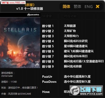 群星v1.0十一项修改器,由3DM风灵月影制作提供,基于游戏1.0版本制作,给玩家准备了无限能源、无限矿物、无限影响力等十一项功能,让那些不熟悉策略游戏的玩家也能顺利进行下去。玩家在使用过程中要注意的是,“瞬间完成勘察”有可能对其他势力的科研飞船生效,不需要勘察时建议取消此功能。