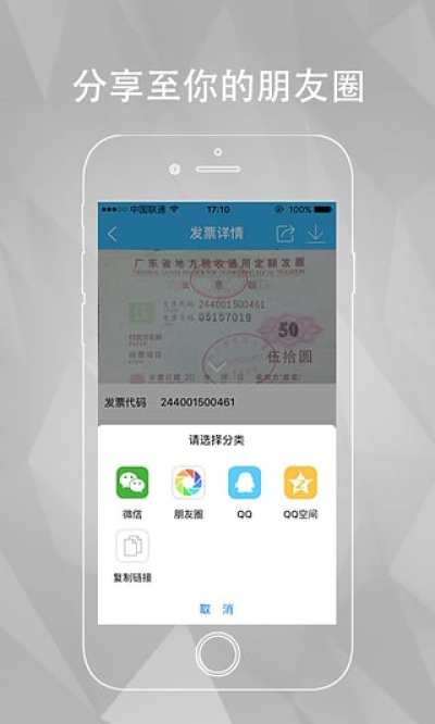 扫描宝支持微信、朋友圈、QQ、QQ空间等分享功能,让用户轻松一点将此发票分享给小伙伴。从而达到最快分享,实现共享协作!