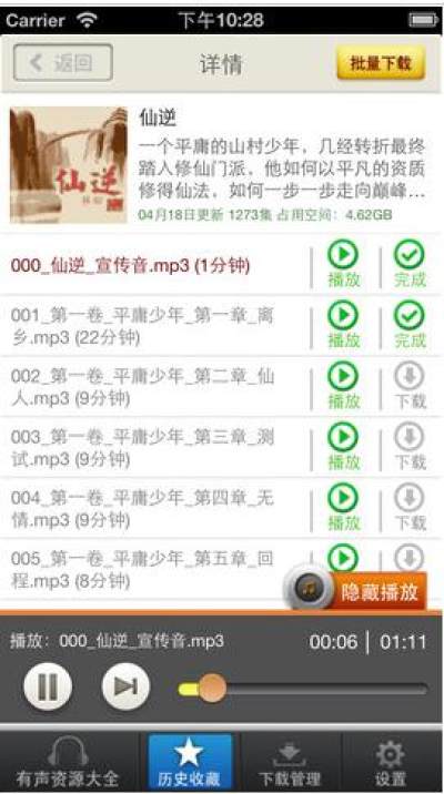 专业播音员录制,玄幻、恐怖、穿越、言情等上百万集热门有声网络小说全部免费点播。