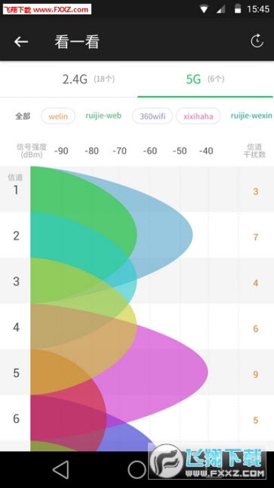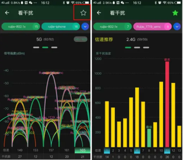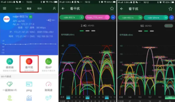 想了解环境里的干扰情况,请点击看干扰,这里的波形图越多代表环境干扰数量越多,波形图越高代表信号越强,其中绿色为当前连接,默认进来是2.4G频道,右滑可以切换到5G,其中2.4G常用的信道是1、6、11,最底部显示每个信道的干扰数