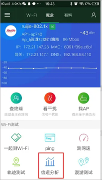 分析信道,对于很多人经常使用,我们在工具箱里有更明显的入口,总之我们告诉你信道目前的拥堵情况,并且告诉哪个信道是最佳信道。如果遇到干扰,切换一个更优的信道,这是解决干扰很重要的一种方式。
