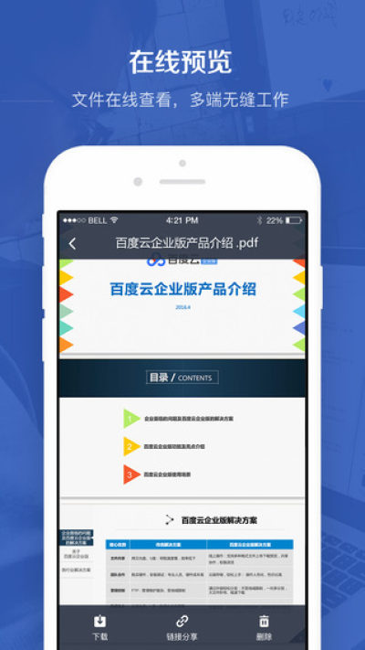 百度云企业版,是百度云推出的一款基于云存储的企业文件协同办公平台,帮助企业实现文件的大容量存储,便于团队成员共享管理,简单、快速、安全。