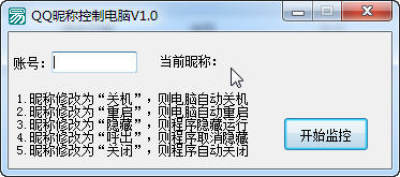 QQ昵称控制电脑是一款可以通过修改QQ昵称的方式监控电脑并对其进行进行控制,支持重启、关机、隐藏关闭程序等等,需要的朋友快来下载试试吧!