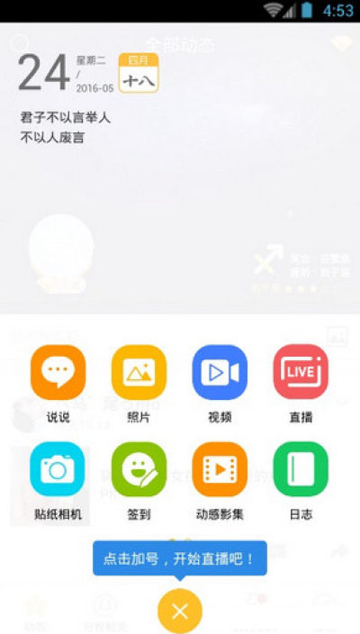 刚更新的新版本发现了好玩的功能,QQ空间开通直播间了~对于腾讯QQ的实力相信大家都很了解,成为直播界的上游不成问题~签约的主播估计也是大牌~还等什么赶紧下载吧。