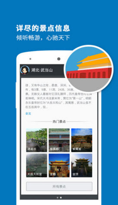 听游天下——武当山导游:专业的智能语音导游系统,专为喜欢自由行的旅行爱好者而设计。携手科大讯飞,带给您独特的武当山印象。