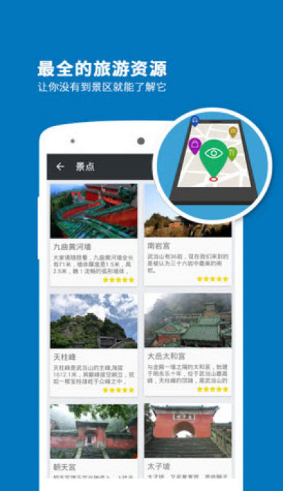 每逢节假日,去武当山旅游的人都会非常多,小编今天给大家推荐的这款武当山导游app为大家介绍了很多关于武当山旅游的攻略,它就像一个导游一样陪伴你左右,给你提供各种旅游帮助,让你的武当山之行更加轻松!