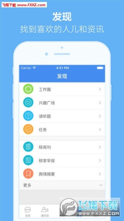 2.消息:单聊/群聊,支持文本、语音、图片、表情包,可上传预览多种办公文档;