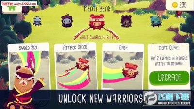 在游玩Bushido Bear时,你会解锁新的忍者角色并升级你的已有角色,从而完全改变你的游戏方式。独行崽动作迟缓但能倚仗他的小个子穿梭敌群之中。幻影熊能瞬间传送到任何地方。奥术熊准备出手时能放慢时间。收集并使用所有的熊吧!