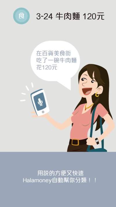 语音记帐的概念是很容易的,当您消费完某项商品之后,不需要盯著萤幕看半天,只需要对著语音图示说一句话,就可以自动帮您把记帐文字记录下来。更棒的是我们可以自动帮您归类,并且记录消费金额。