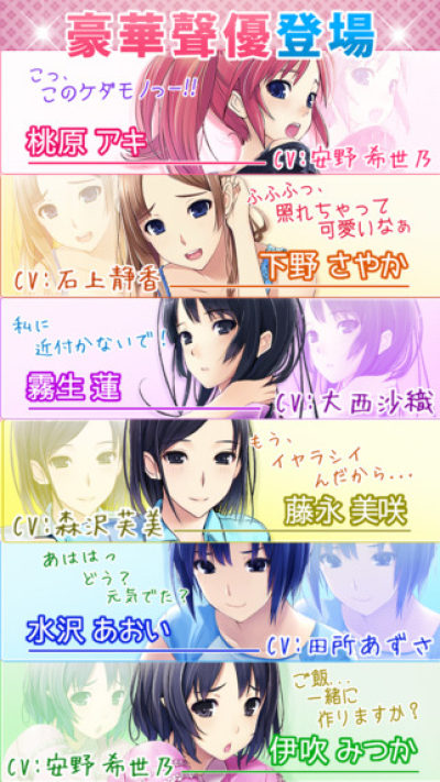 一款全语音的恋爱虚拟游戏!!由日本注目的人气声优,木戸衣吹、田所梓、大西沙织、安野希世乃、石上静香、森沢芙美等共六人所贡献配音的繁体中文字幕版「女子宿舍禁爱令」!