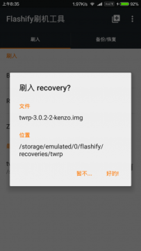 安装flashify,打开后点击rec镜像。选择下载第一个TWRP,然后会出现三个rec选项,点击随便下载一个,不要全部下载完,浪费流量。这时候进入文件管理器,会产生一个flashify文件夹,依次打开,然后把要刷的rec的img文件 命名为刚才下载那个文件名一样,再移动到里面,我以第一个为例,命名好,再到flashify点击第一个下载,自动就会弹出刷入的界面,点击好的,就可以了。然后重启进入rec,就这么成功了。