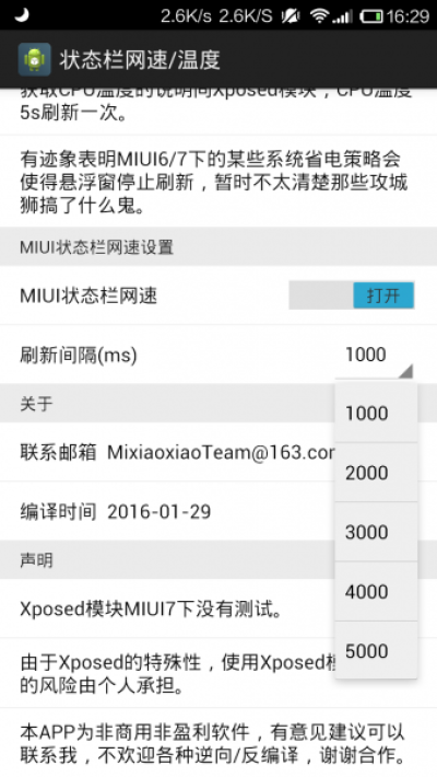 3、[新增]支持自由设置MIUI自带的状态栏网速的刷新间隔,其实在早期的MIUIv5版本中是可以选择网速刷新间隔的,后来由于未知原因这个设置不见了。此APP支持了自由设置网速的刷新间隔(1000ms~5000ms)。