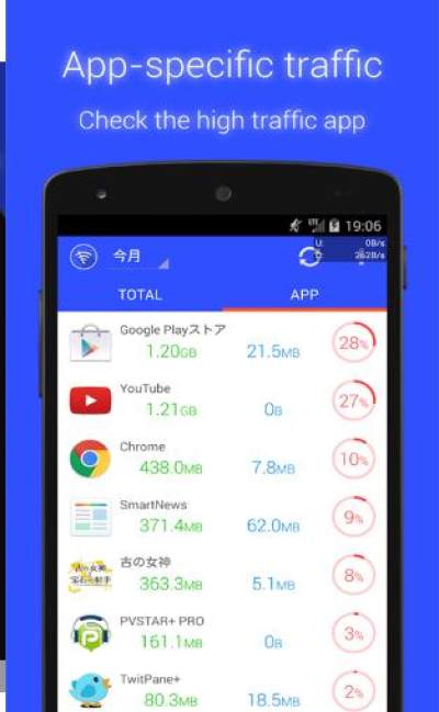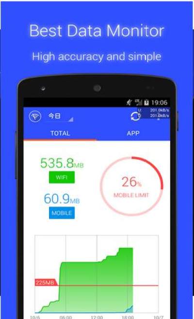 易于阅读的统计数据屏幕 - 测量数据的使用是由Wi-Fi的使用和移动应用分离,以易于阅读的图形显示。每个应用程序使用的数据也可以显示出来,这样你就可以知道哪些应用程序使用最多的数据。