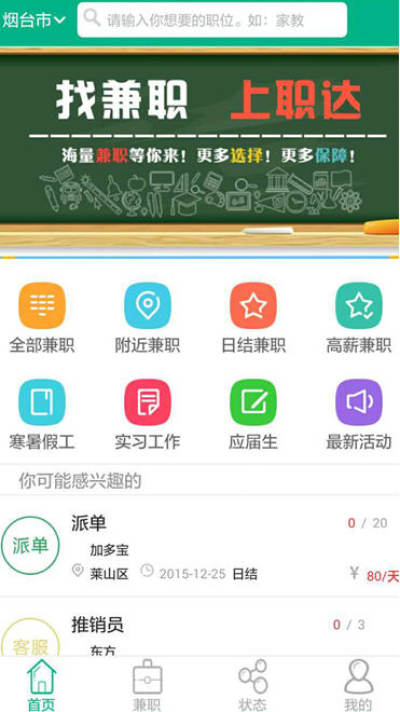 职达校园是一个以服务校园兼职市场为主的O2O平台,旨在利用移动互联网平台,通过规范兼职市场,来帮助大学生找到更多靠谱的兼职机会,帮助企业节约人力资源成本,及时精准找到合适的人才,解决临时用工需求