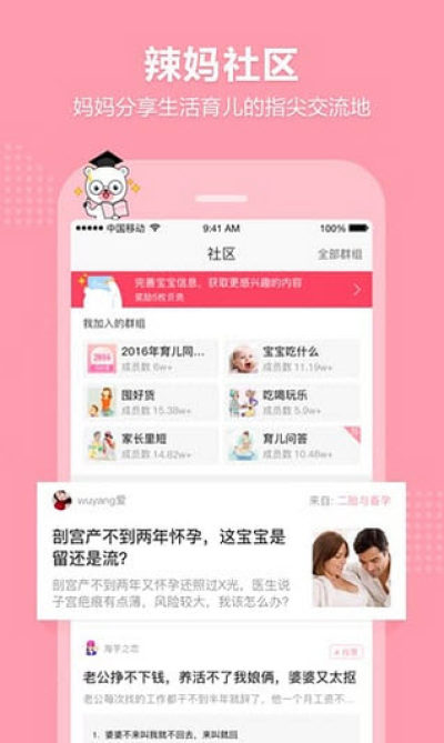 在育儿宝,不仅可以交流孕产、育儿经验,还有专业的育儿工具、海量育儿知识库,更有妈妈们都爱的免费试用、专家讲座等活动。
