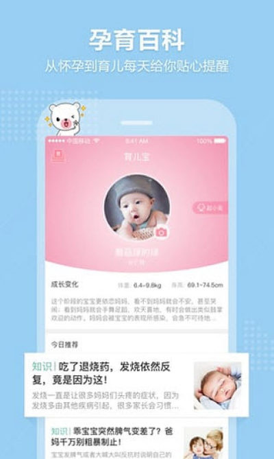 为每个妈妈提供定制的专属孕育知识指导,为宝贝提供科学的成长标准指南,细到胎重、胎长、体重、身高、年龄特征等成长变化,从怀孕到育儿每天给你贴心提醒!