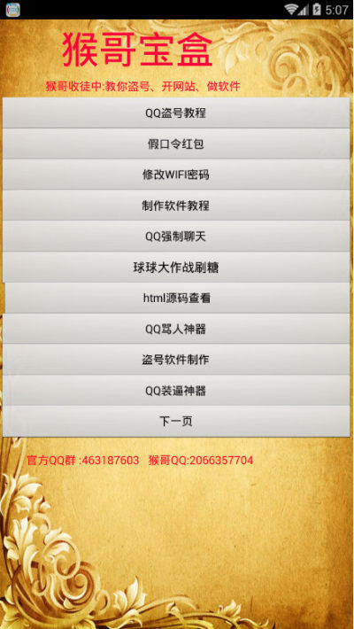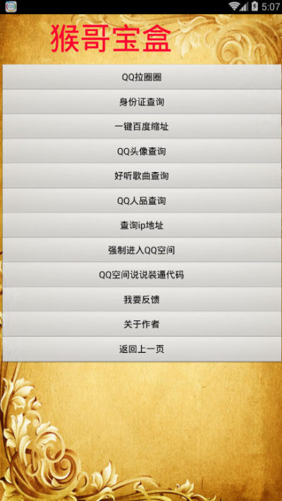 猴哥宝盒app是一款集合多种工具的手机多功能工具箱。用户可以通过猴哥宝盒盗号,帮助你生成装逼图片,还有刷qq会员、刷CF手游枪、刷王者荣耀点卷、手机轰炸机等,有需要的用户可以下载使用。