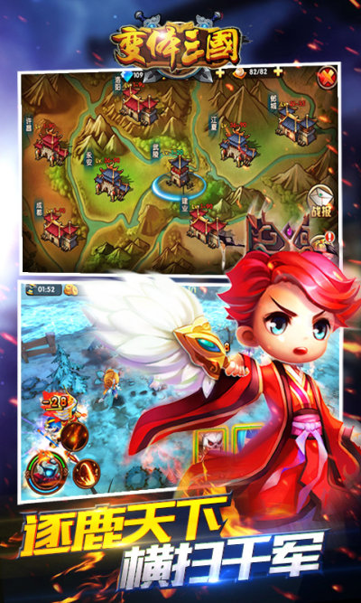 《变体三国》是一款3D动作卡牌手游,画风Q萌可爱,简易的游戏操作、激烈爽快的战斗体验、华丽酷炫的画面效果、率先将主公变体、武将羁绊融为一体。