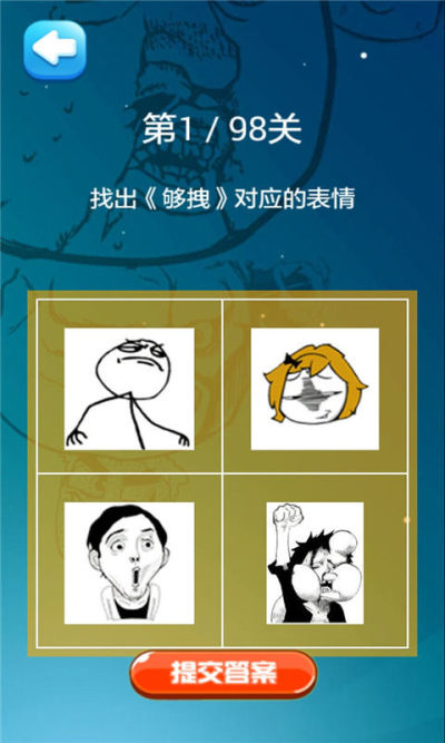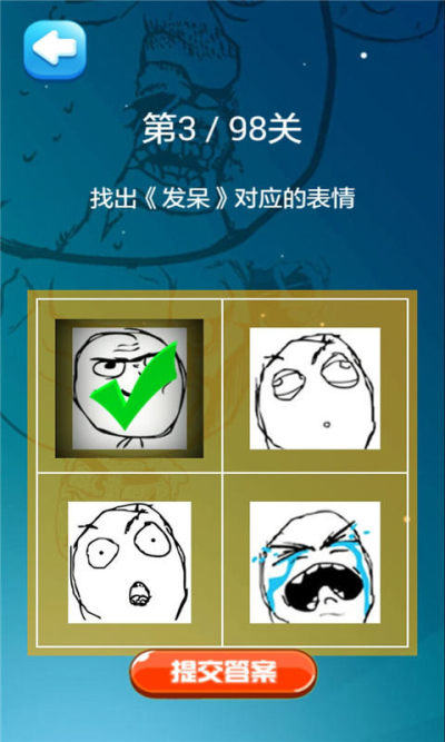 现在的聊天软件都有一些暴走的表情, 有的表情很搞笑,表情什么意思很多人一看就知道了, 你是否熟悉了每个表情的意思呢, 点击开始游戏,根据提示,从四副备选图中选出对应的表情图片, 只要你了解每个意思,通关是没有问题的 暴走表情大作战,是不是表情达人。