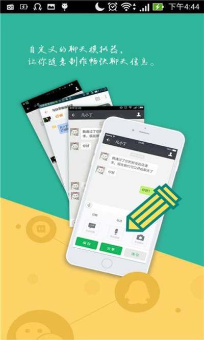 一款实用的聊天记录生成工具,真实模拟微信、QQ、陌陌聊天软件、无水印,支持自定义聊天内容,头像、时间、昵称均可编辑更换,完美达到你想要导演的情境。编辑好之后可直接点击保存至图库,也可直接点击享,分享给朋友秀一秀,简单方便,发到朋友圈,你的小伙伴们一定都 会惊呆啦!