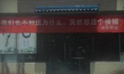 四川德阳中江街上,一家餐馆莫名其妙挂了一条“我们也不知道为什么,突然想挂个横幅”,然后其他店家纷纷效仿。横幅被城管拆了几天后,竟然又冒出了横幅“我也不知道为什么,他们的都拆了我们的还在!