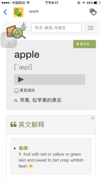 - 英语词典的词汇页包括:中英/英英解释,英语例句分享、单词音标,在线单词词组发音、时态查询、拼写提示纠正、词根背单词法总结