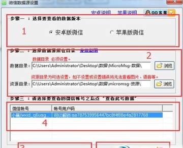 安卓手机:数据目录设置为导出来的数据 MicroMsg 文件夹,资源目录设置为导出来的资源 MicroMsg文件夹。