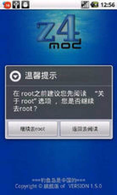 在手机端安装z4root以后,点击root,然后手机自动重启即可root,如果root不成功或者出现bug,重启机器即可恢复之前状态。G3和MileStone测试成功,其他机型请自测。还有就是这个软件很傻瓜式的,手机不会变砖哦,请放心使用。