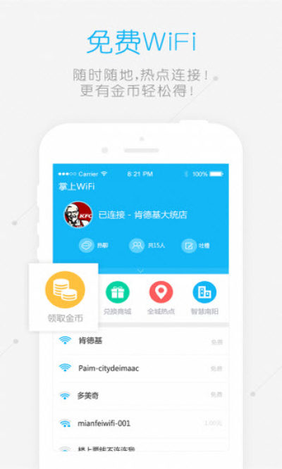 打开掌上WiFi,就可每日领取金币,获取的金币可在商城兑换商品,话费充值卡,iPhone各种商品任你选择!