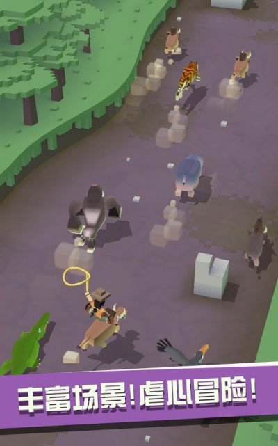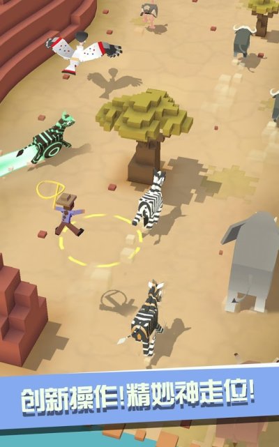 《疯狂动物园》是一款集3D像素、急速跑酷和模拟养成为一体的休闲小游戏。在游戏中你将扮演一名富有冒险精神的绝世牛仔。在高速移动的情况下与各种动物一较高下。你要尽可能多的套住动物,将它们统统带回飞船上的“空中动物园”中饲养;并进行园区升级,以便迎来世界各地的游客光临赚取更多金币。