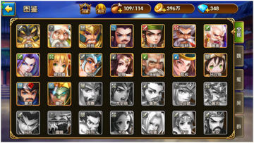 图鉴实际上也相当于一个小的收集系统,一进来我们可以看到有些武将的头像是灰的有的头像是彩色的,武将头像颜色实际上表示着该武将是否在图鉴中已点亮,只要获得过一次对应的武将(任意品质都可)即可点亮对应的武将头像,头像即可变成彩色。