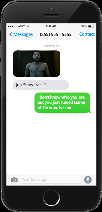 没想到竟然会有这样一款丧心病狂的软件,它可以向你最讨厌的人剧透《权力的游戏》,用户只需要给它一个对方的手机号码即可。这款丧失的软件叫Spoiled.io,售价0.99美元,它能够实时地向用户的仇敌推送《权力的游戏》的最新剧情,并且还可能会有图片--这简直是要了这位“敌人”的命。根据Spoiled.io开发者介绍,他是受了一对分手情侣故事的启发。据悉,女孩受到了男孩欺骗,于是在分手之后她每天给前男友发送《权力的游戏》的最新剧情。为了让能自己不被前男友屏蔽掉,于是这位女孩借用朋友们的电话继续剧透。