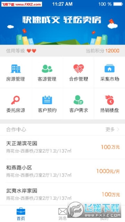 房客通是 房100 精心出品的一款能为中介门店提升效益的整合营销系统,集成房源管理、客源管理、业主房源采集、房源群发等ERP管理功能,合作中心为经纪人发起或承接房源合作与客源合作,提升交易效率。同时提供经纪人销售新楼盘,报备和带看用户到意向楼盘,成交后获取佣金奖励。