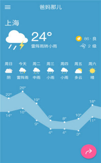 准天气:一款简洁优雅的天气App,拥有干净简洁的设计、便捷直观的提醒、优雅美观的分享效果。满足基础的天气查询需求,查询今天天气情况、未来天气趋势、空气质量和风力。随时间变化背景色,无论白天黑夜查询天气,都清新舒适。
