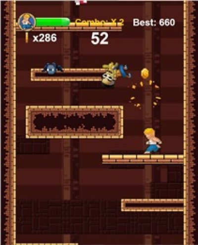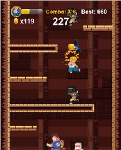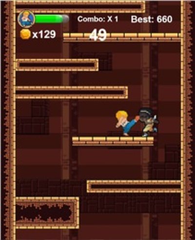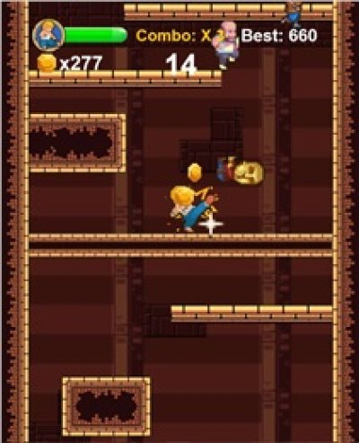 游戏玩法类似于涂鸦跳跃,玩家需要不断的跳跃来进行攀爬,同时在不断的向上过程中,要注意击败挡在路上的敌人来获取金币,如果被击倒或是没来得及爬楼,游戏就会game over!
