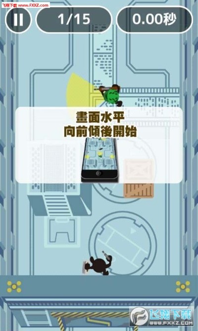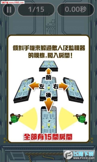 将手机前后左右移动来控制小黑人走的方向。有15关要通过,在通关的路样上会遇到配枪、身上有手电筒的巡逻人员,也会有摄影机。