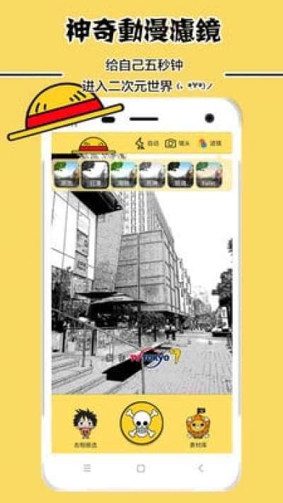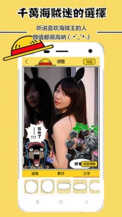 海贼动漫相机是一款以海贼王为主题的贴纸相机,海贼王很有内涵,挖掘出来用在拍照上也是个不错的点子,譬如第一张截图就非常经典。