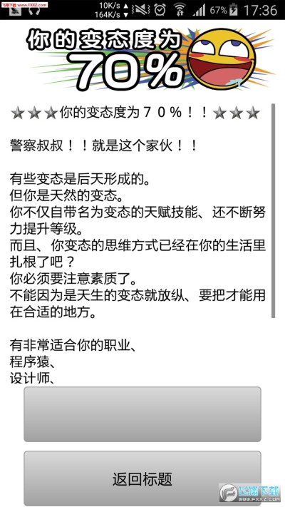 体积很小巧的休闲测试游戏,测试你的 hentai 程度。这不科学,小编这样的阳光好少年,居然。。。。。