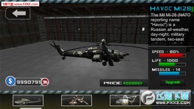 游戏是一款3D画面的直升机游戏,玩家可以选择多款新式的直升战机去完成各种任务,还可以用金币来升级更强大的武器和弹药。