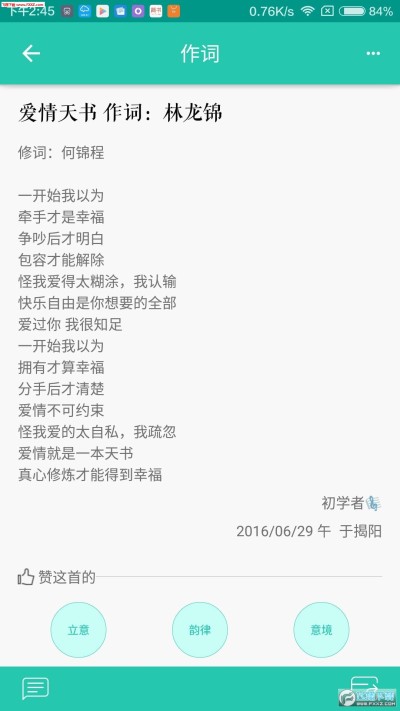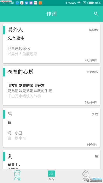 作词是一个文字创作社区,里边文艺味儿十足,虽然叫做作词但不局限于词,有啥灵感都可以写写。 有兽 作词 很简单 多敲 几个 换行符 就行了 哈哈