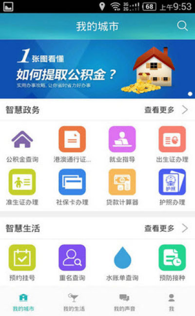 1.我的城市:提供公积金、经营许可、文体服务、生活周边、智能出行等600余项服务。