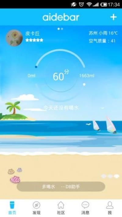 1、饮水量记录。D8智能保温杯采集的饮水数据,通过手机蓝牙实时回传,并在云端保存饮水记录,你可以按天查看每一次饮水数据,也可以按月查看; 2、智能饮水提醒。通过小助手提醒你按时喝水、提前盛水,让你不会口渴了才记得喝水,也不会因为没空盛水而不喝水; 3、互动饮水提醒。关注自己关心的亲朋好友的水杯,查看对方的饮水状态,通过有趣的方式提醒对方喝水,并进行情感交流; 4、饮水评估分析。对你每日饮水进行打分,分析加分减分的原因,在趣味中帮助养成健康饮水好习惯; 5、健康饮水报告。我们会将每天的饮水数据的统计和分析结果整理成健康饮水报告,通过小助手分享给每个用户,每个用户可以将自己的饮水报告分享给小伙伴寻求支持。 6、定制饮水计划。每个用户可以输入个人的性别、体重数据,并根据运动和饮食状况,定制自己的个性化饮水计划,饮水计划还可以根据气温和湿度的不同而进行调整。