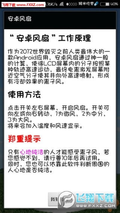 将您的手机变为电风扇!作为2012世界毁灭之前人类最伟大的一款Android应用,安卓风扇通过神一般的计算,使得LCD屏幕内的分子按照某种轨迹高速运动,最终电离激发并冷却屏幕附近空气分子使其向外高速喷射,形成离子风