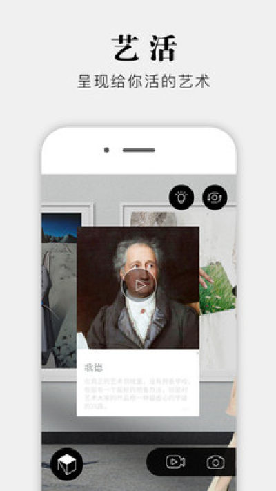 开启摄像头,扫描艺术品,获取艺术背后的故事。应用支持拍照和视频录制,以及分享到微信朋友圈和微博。