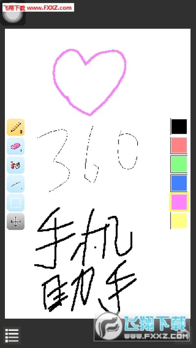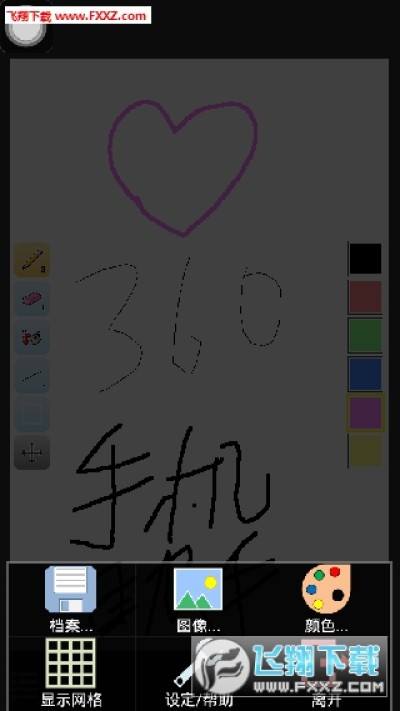 可读入 PNG/BMP/JPG/GIF 档; 可储存 PNG 档 设有装置直放及横放的介面- 基本图形、不同大小的笔及橡皮擦、范围灌色、图上取色及编辑还原功能等
