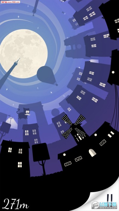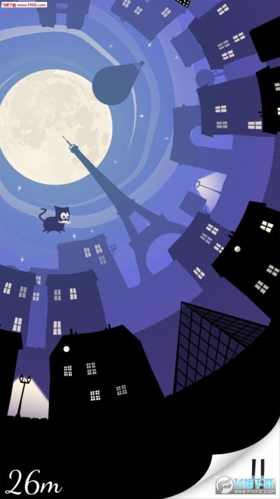 独立游戏开发者 Laurent Bakowski 出品,剪影风格,滑动屏幕旋转场景,让猫咪保持在屋顶上不要掉下。