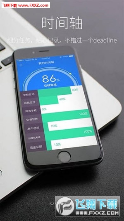 2.时间轴:细分申请任务、贴心记录申请过程中学生取得的阶段性成就以及与学校的互动,同时提供任务提醒,不错过一个Deadline。