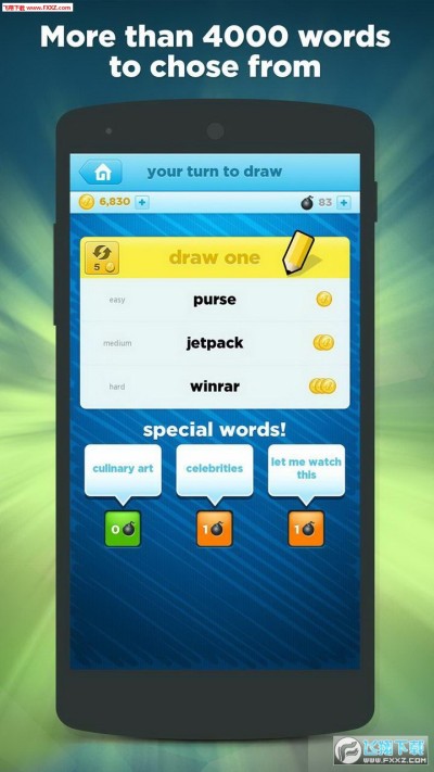 风靡各大社交网络的你画我猜的多人娱乐应用。近期美区App Store榜首的应用安卓版。有点类似于你画我猜一类的应用,将玩家可从三个备选词中选择一个画一幅画,然后发送给好友猜是描述什么单词,猜对便能和对方一起获得金币。玩家可选择Facebook或邮箱登陆,使用Facebook的玩家能方便邀请身边的朋友一起玩。此外,游戏中赚得的金币能用于购买道具或颜色,让玩家能更创作更形象的图画。